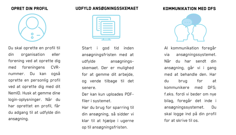 Når du har sendt din ansøgning til os, vil al kommunikation mellem dig som ansøger og DFS, foregå via ansøgningssystemet.